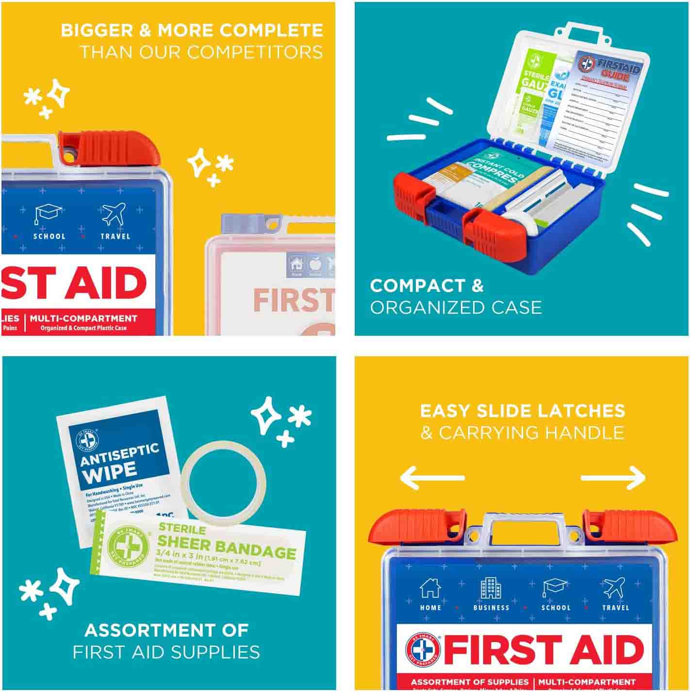 Bộ dụng cụ sơ cứu 180 mảnh nhựa áp dụng công tắc trơn trơn đẩy đẩy đôi và thiết kế mờ, giúp dễ dàng xem các nguồn cung cấp y tế. Đồng thời, có các ngăn ở hai tầng bên trong, có thể được phân loại cho các loại thuốc khác nhau để dễ dàng truy cập.