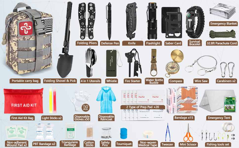 Bộ dụng cụ cứu hộ khẩn cấp và bộ sơ cứu 238 chiếc được thiết kế dành cho người đi bộ đường dài, người cắm trại, đội cứu hộ và bất kỳ ai chuẩn bị cho những trường hợp khẩn cấp ngoài trời bất ngờ. Sử dụng vật liệu bền, chịu được thời tiết và cấp độ chuyên nghiệp thành phần, điều nàykit cung cấp các công cụ cần thiết để sinh tồn, điều hướng, sơ cứu và phát tín hiệu khẩn cấp.
